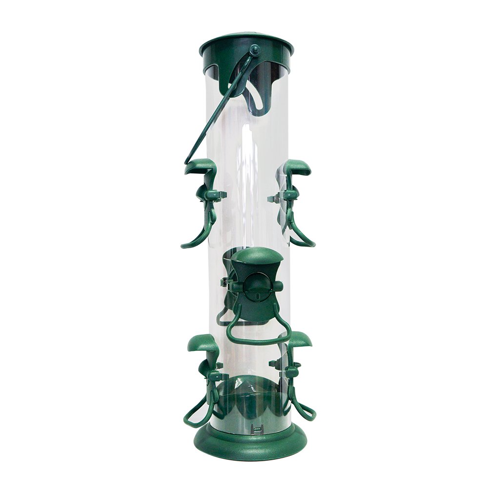 1. Para llenar el alimentador, destape la tapa y suministre la ración de semillas. 3. Coloque la tapa nuevamente y asegúrese de que quede cerrada correctamente. 3. Cuelgue el alimentador en un lugar estable con ayuda del gancho incluido. 4. Dependiendo del tamaño de semillas utilizadas, abra o deje cerradas las pequeñas puertas según sea necesario. Limpieza: Lave con abundante agua tibia su Alimentador de Semillas para Aves de Redkite mínimo cada semana, con mayor frecuencia en climas cálidos. En caso de notar manchas u hongos, puede utilizar vinagre para desinfectar. Enjuague antes de volver a llenar el alimentador.