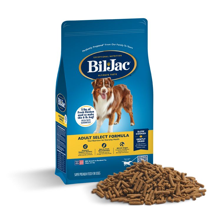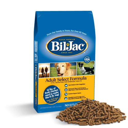 Bil-Jac Adulto Selecta está especialmente formulada con los nutrientes que necesita su perro adulto. 25 libras de pollo real se utilizan para hacer 30 lb. de este alimento.