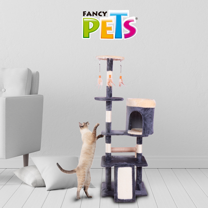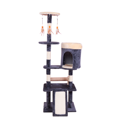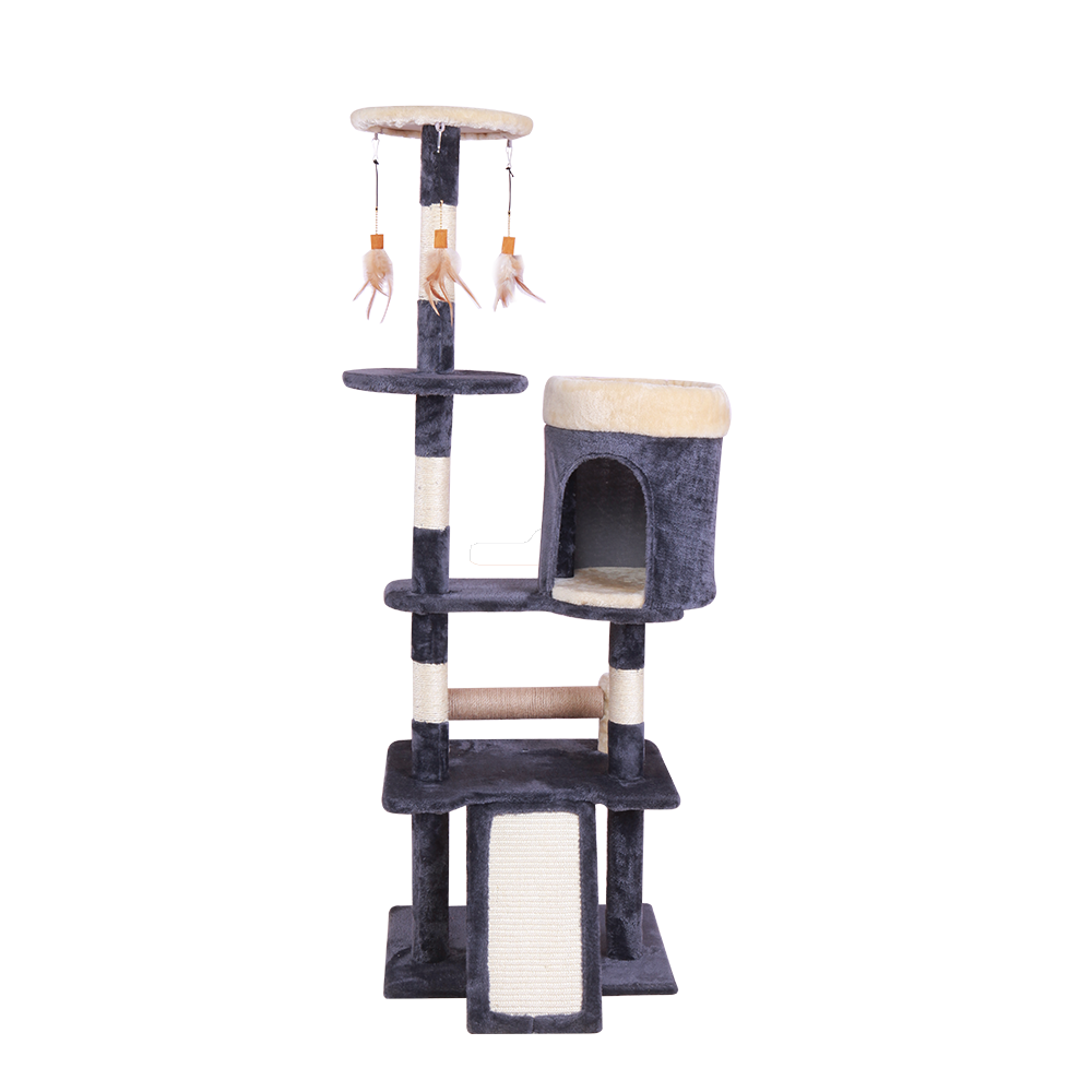 Características: Casa cubierta de felpa suave. Juguete colgante para incitar la caza. Postes rascadores completamente envueltos de sisal para saciar su instinto rascador. Beneficios: - Para el gato: Los muebles para gato están diseñados para brindarle a tu gato un espacio para ejercitarse y liberar estrés, así como para delimitar su territorio, descansar, saltar, jugar y perfeccionar su habilidad de caza. - Para el dueño: Ayuda a evitar que el gato dañe los muebles del hogar y es fácil de armar (incluye instructivo). Medidas: 48 cm de largo x 35 cm de ancho x 143 cm de alto