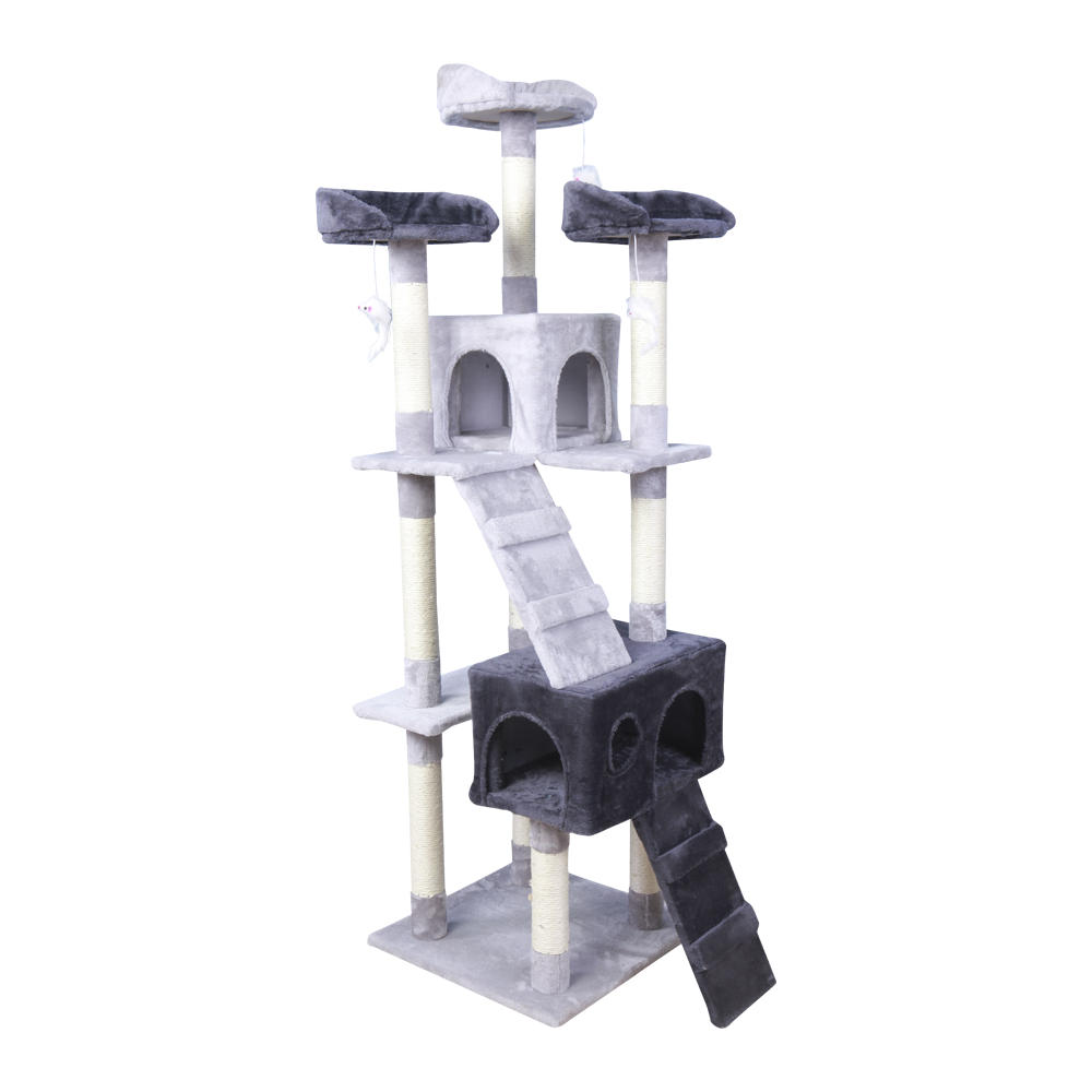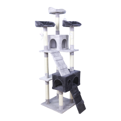 CARACTERÍSTICAS: - Suave al tacto - Color Gris Oscuro con Gris Claro - 6 Postes rascadores, envueltos en sisal - 4 Plataformas de descanso en diferentes niveles - 2 Casas - Escaleras BENEFICIOS: - El enriquecimiento ambiental permite estimular cognitivamente a los gatos - El gato podrá rascar para afilar sus garras - El juego ayudará al instinto de caza - Las casas brindan zonas de descanso y protección solar. MEDIDAS: -50 X 50 X 170 CM MATERIALES: -Felpa suave con postes rascadores de sisal natural (4.0 mm). -Madera prensa.
