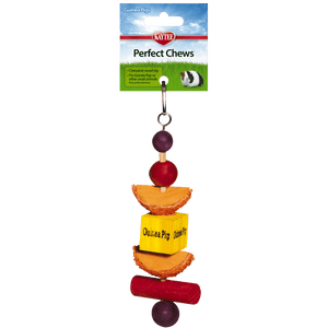 La combinación de texturas crujientes ayuda a limpiar y recortar los dientes mientras satisface el instinto de los animales pequeños de masticar y roer. ¡El juguete masticable se cuelga en cualquier lugar de la jaula de tu mascota! tiene numerosos masticables coloridos en un pincho de madera que está rematado con un broche para unirlo fácilmente a la jaula o al hábitat de su mascota.