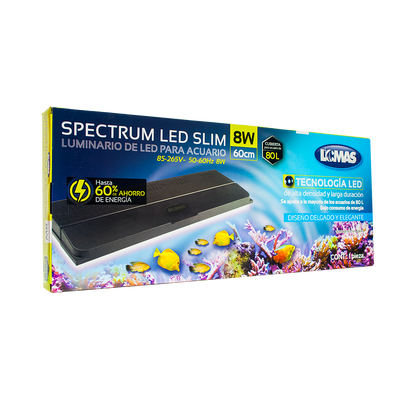 Spectrum Led Slim, luminario de led para acuario. Hasta un 60% de ahorro de energía. De alta densidad y larga duración. Se ajusta a la mayoría de los acuarios de 80L. Bajo consumo de energía. Diseño delgado y elegante. Especificaciones eléctricas: 85-265V~50-60 Hz 8W. Consumo de energía en operación del aparato: 0,0065KWh. Lúmenes: 709lm. Temperatura de color: 8670°K.