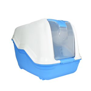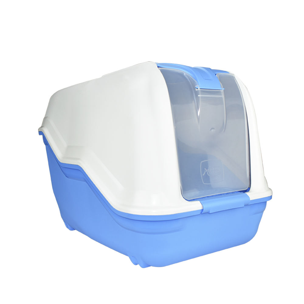 Arenero Netta grande con tapa y puerta abatible tapa y puerta abatible para facilitar la limpieza del arenero, escalón para facilitar la entrada y salida del gato, garantizando una mejor limpieza de sus patas, agarradera diseñada para bloquear y desbloquear la tapa permitiendo transportar de manera segura el arenero. Filtro de carbón activado en la ventana superior de la cubierta para neutralizar el olor proveniente de la arena y evitar su propagación al exterior. Incluye: filtro de carbón activado y pala de plástico Colores disponibles: Azul y verde Medidas: Profundidad: 66 cm Frente: 49 cm Altura: 50 cm
