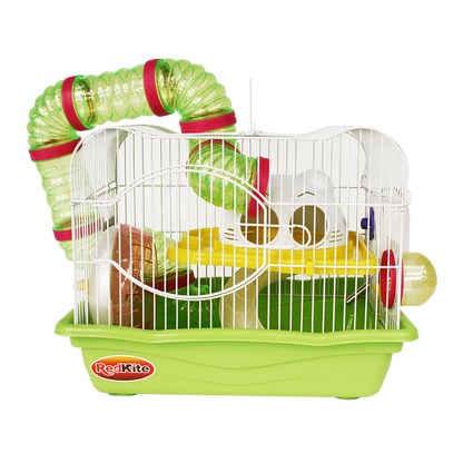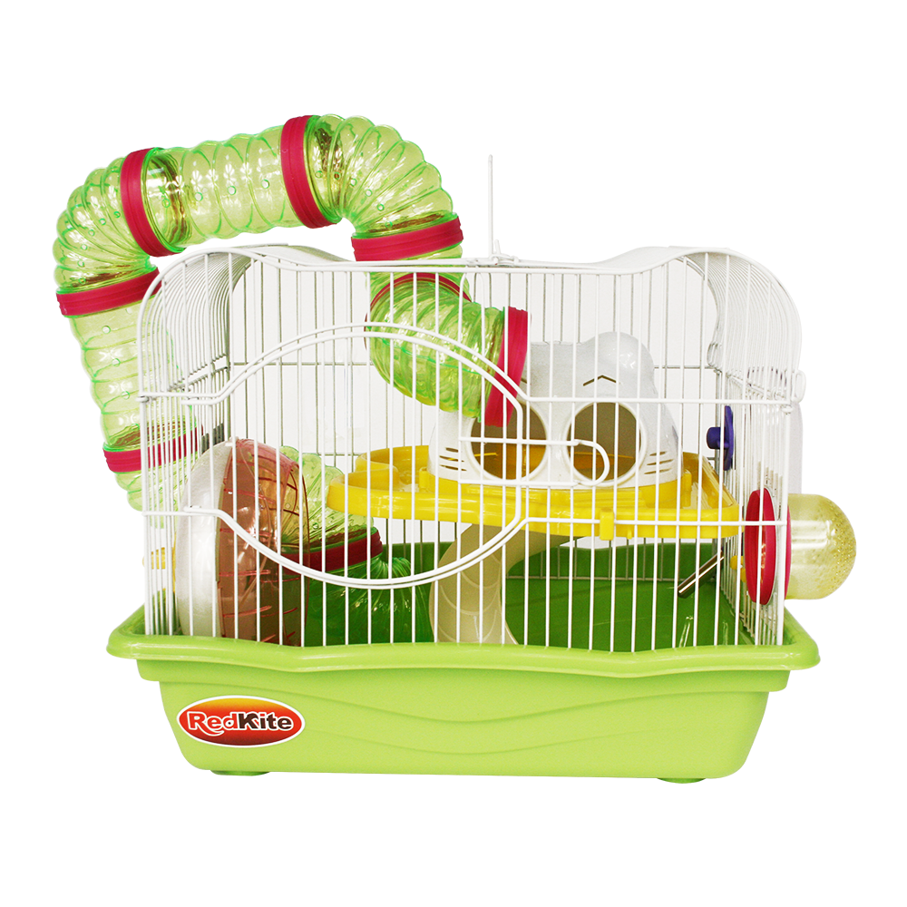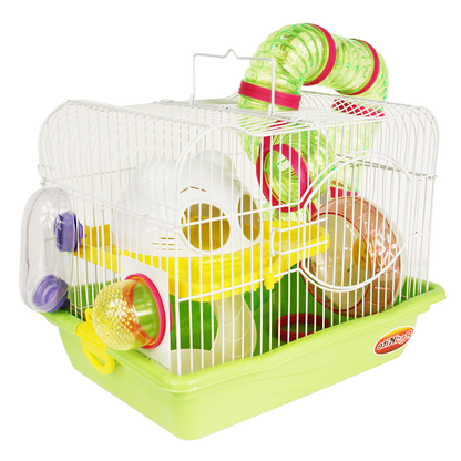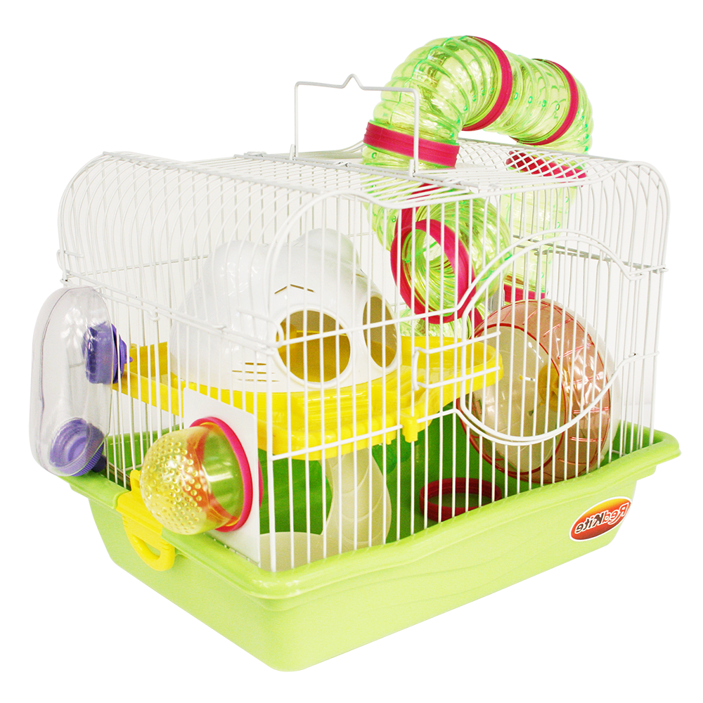 Incluye rueda para hacer ejercicio, túnel y escalera, plataforma con madriguera, tazón para alimento y bebedero para roedor. Techo abatible diseñado especialmente para facilitar el mantenimiento. Diseño divertido, con apariencia de dibujos animados. Puerta frontal circular grande. Seguros a cada lado para fijar la parte metálica con la base plástica. Pintura libre de plomo, por lo que no es tóxica. Brinda seguridad y confort. Permite observar las actividades del hámster. Material resistente.