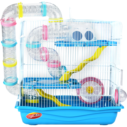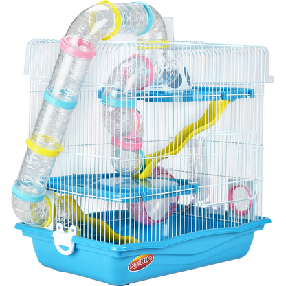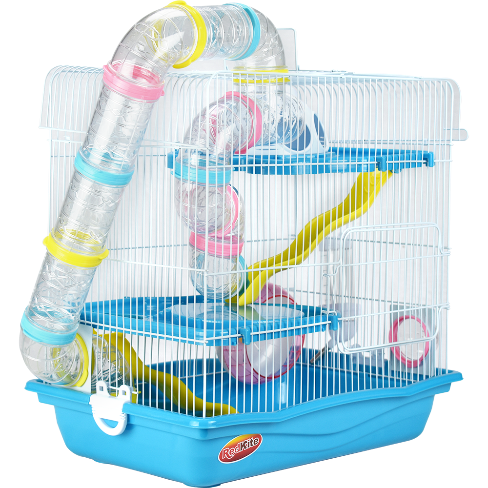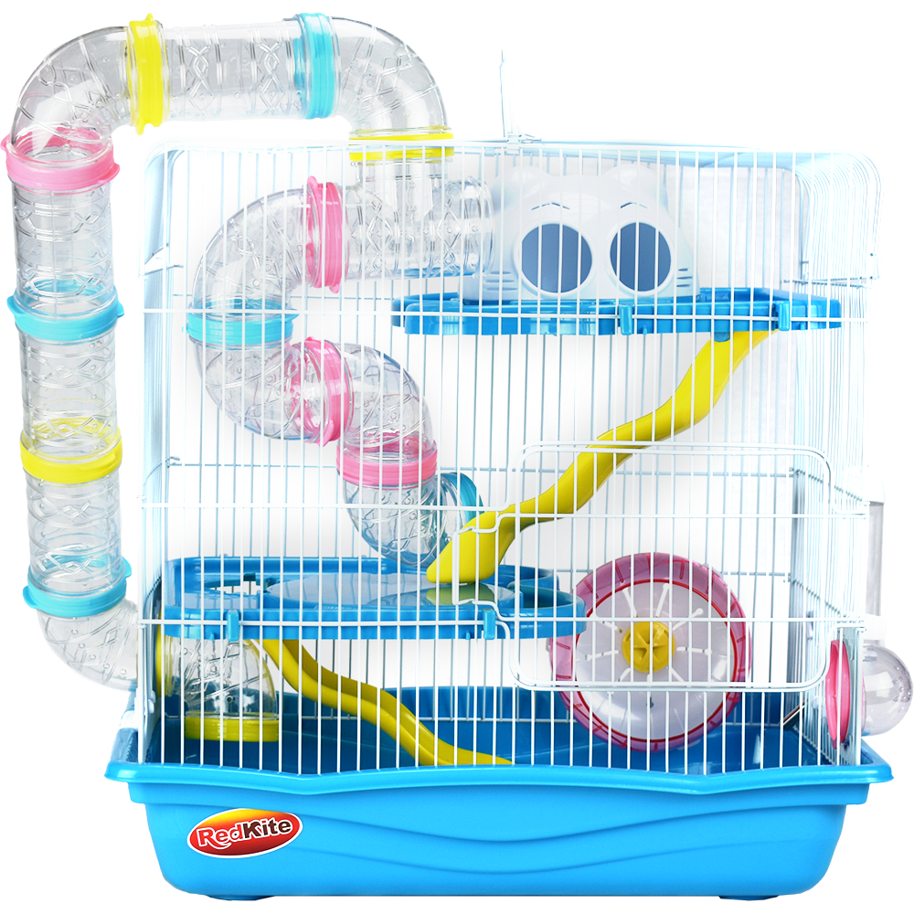 Jaula de metal con base plástica. Colores variados. Incluye túnel, resbaladilla, casa, rueda para hacer ejercicio, tazón para alimento y bebedero. Pintura libre de plomo, por lo que no es tóxica para su hámster. Colores surtidos. Cuerpo y rejillas blanco; accesorios azules (claro u oscuro); base azul (claro u oscuro).