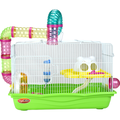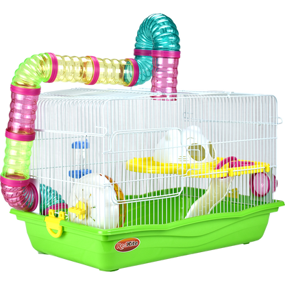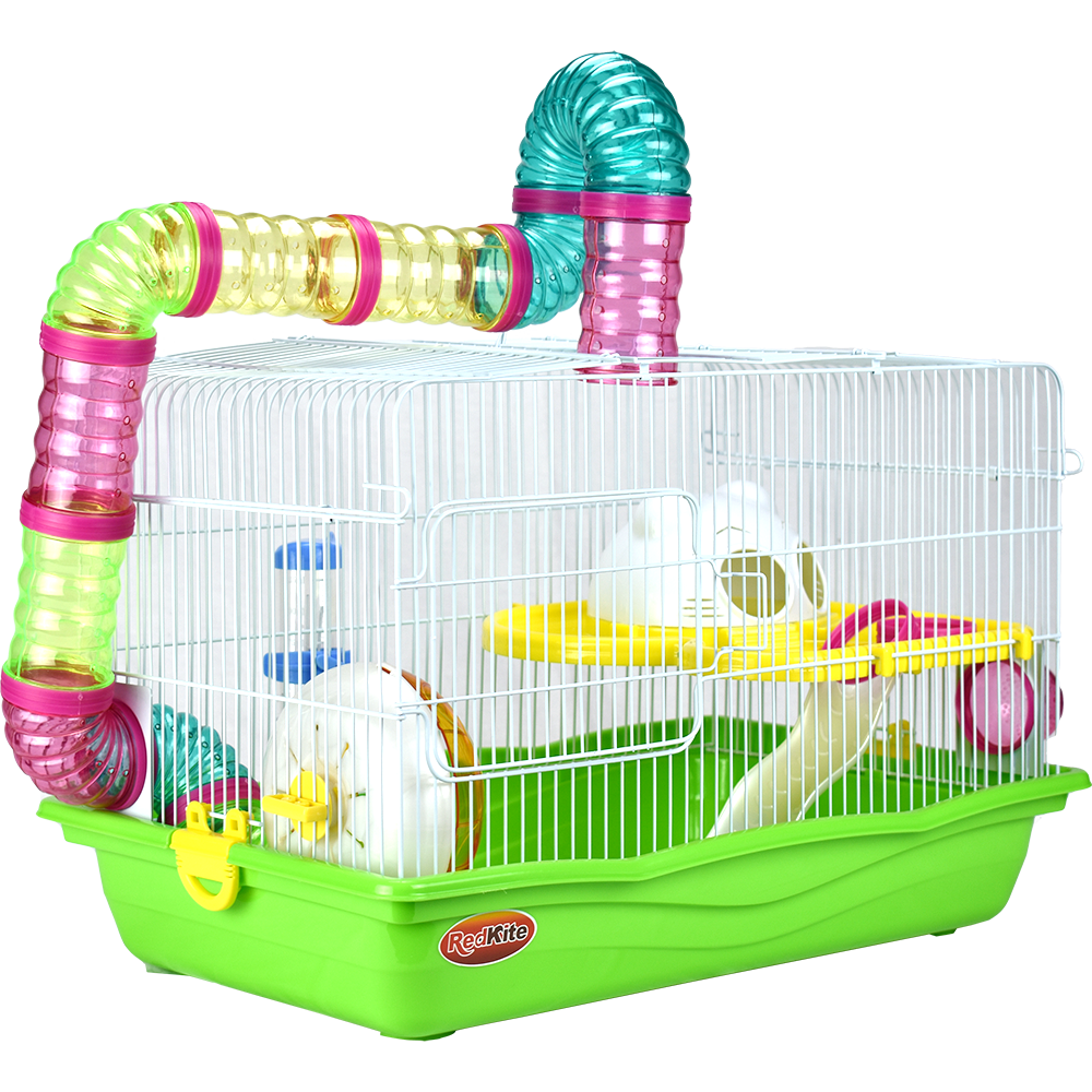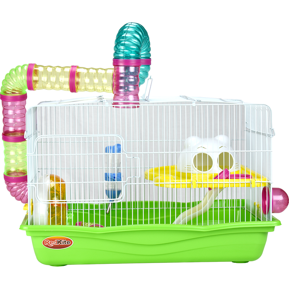 Jaula de metal con base plástica. Colores variados. Incluye túnel, resbaladilla, casa, rueda para hacer ejercicio, tazón para alimento y bebedero. Pintura libre de plomo, por lo que no es tóxica para su hámster. Colores surtidos. Cuerpo y rejillas blanco; accesorios azules (claro u oscuro); base azul (claro u oscuro).