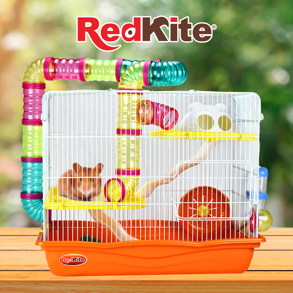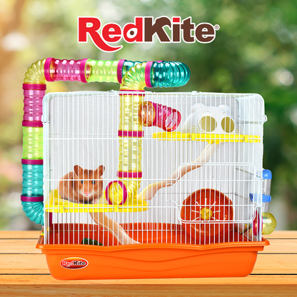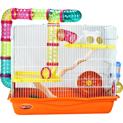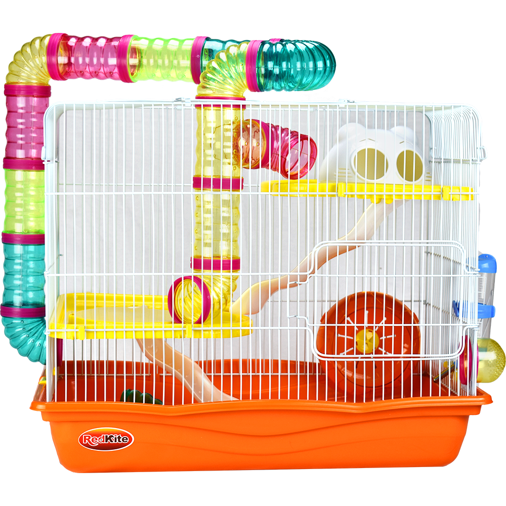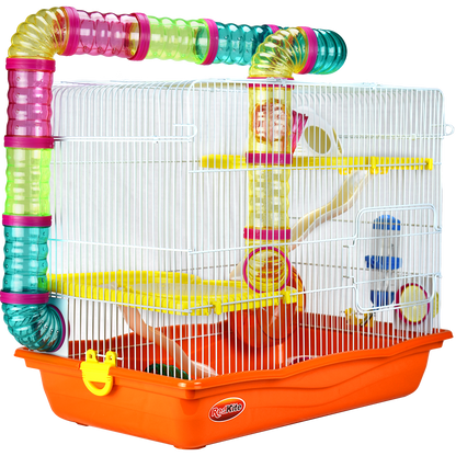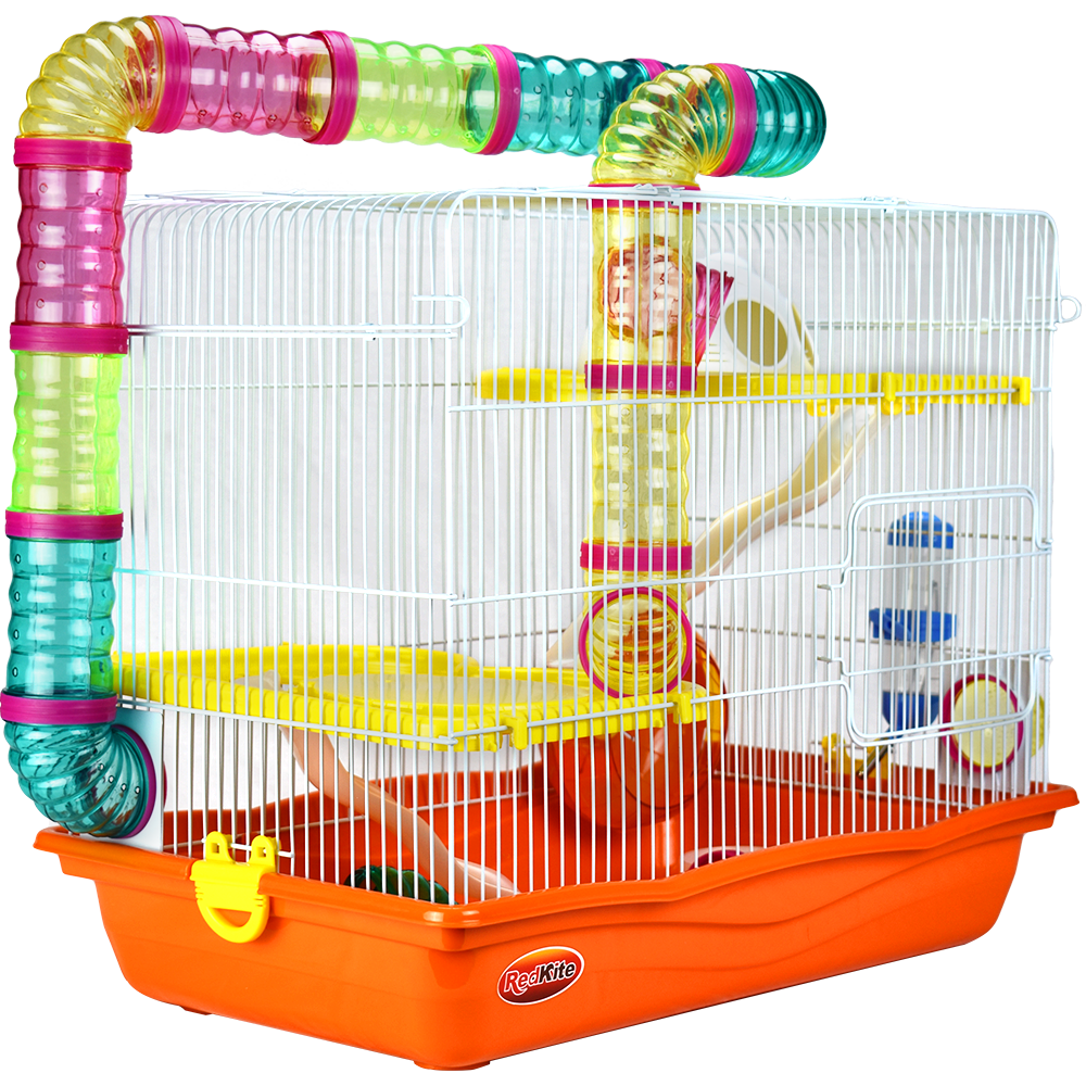 Jaula de metal con base plástica. Colores variados. Incluye túnel, resbaladilla, casa, rueda para hacer ejercicio, tazón para alimento y bebedero. Pintura libre de plomo, por lo que no es tóxica para su hámster. Colores surtidos. Cuerpo y rejillas blanco; accesorios blancos o azules; base café (y/o subtonalidades), café con beige o azul con blanco.