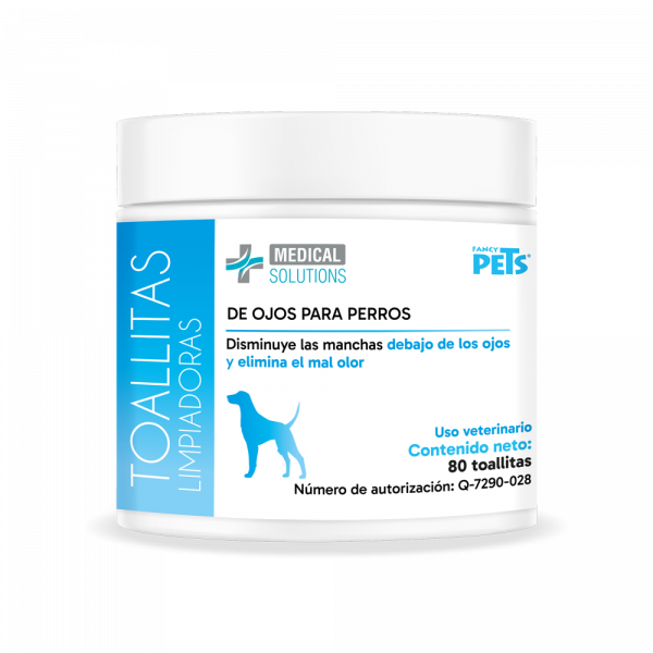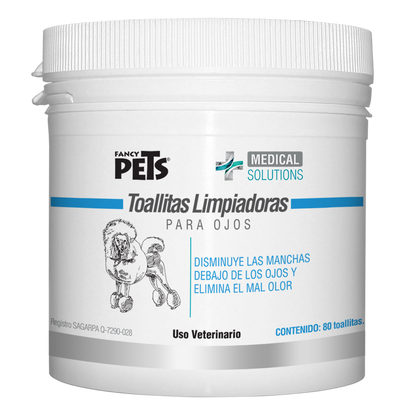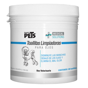 Fancy Pets Medical Solutions Toallitas Limpiadoras para Ojos previenen, controlan y disminuyen las manchas que se forman alrededor del ojo de perros y gatos, causadas por diversos factores como el lagrimeo constante de la mascota e infecciones comunes, dejando una fragancia fresca y agradable.